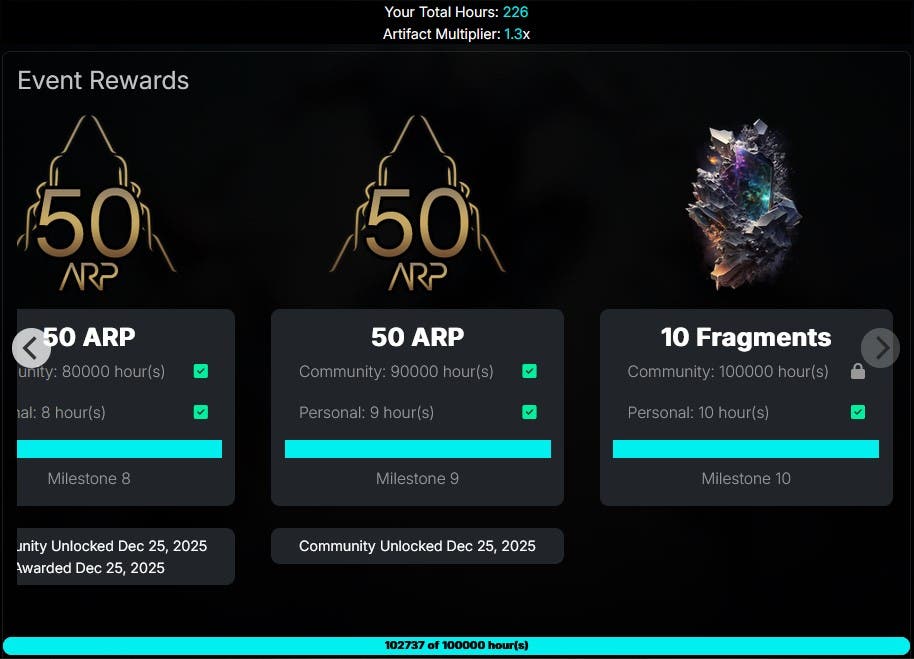 My 10 frags from the community quest have dropped, also the achievement for completing hours on a community quest. I saw the achievement, then checked for the Frags. Result. I'm happy, thx Alienware.